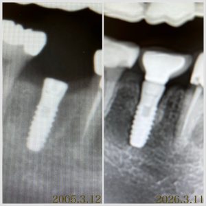 2026.03.14 ブログ 長期インプラント症例 久しぶりに来られて21年前に施術したインプラント、まだ頑張って噛めているそうです、前後の歯はまた治療必要そうですが、インプラント否定的な方もいらっしゃいますがシンプルな処置、位置なら長期にも持ちます。でも自分の歯が1番良いですね、残っている歯を大切にしましましょう! 前へ « 一覧へ